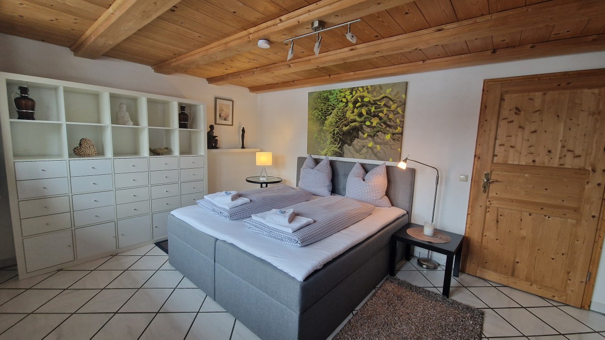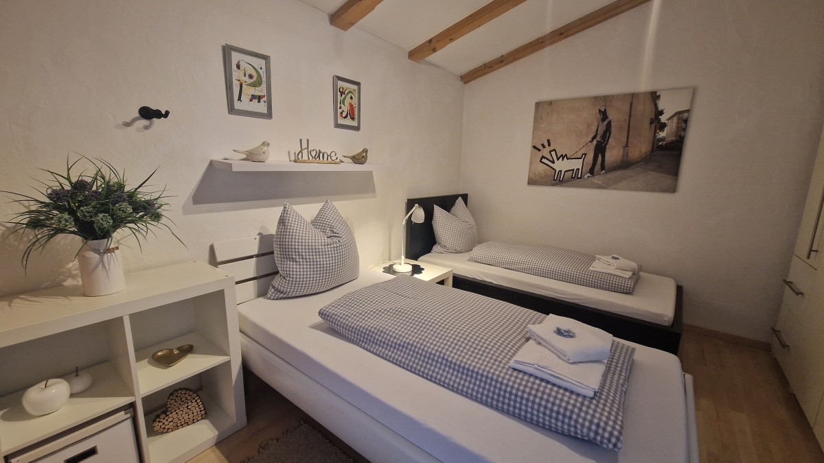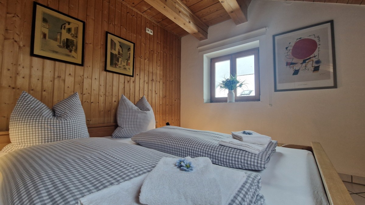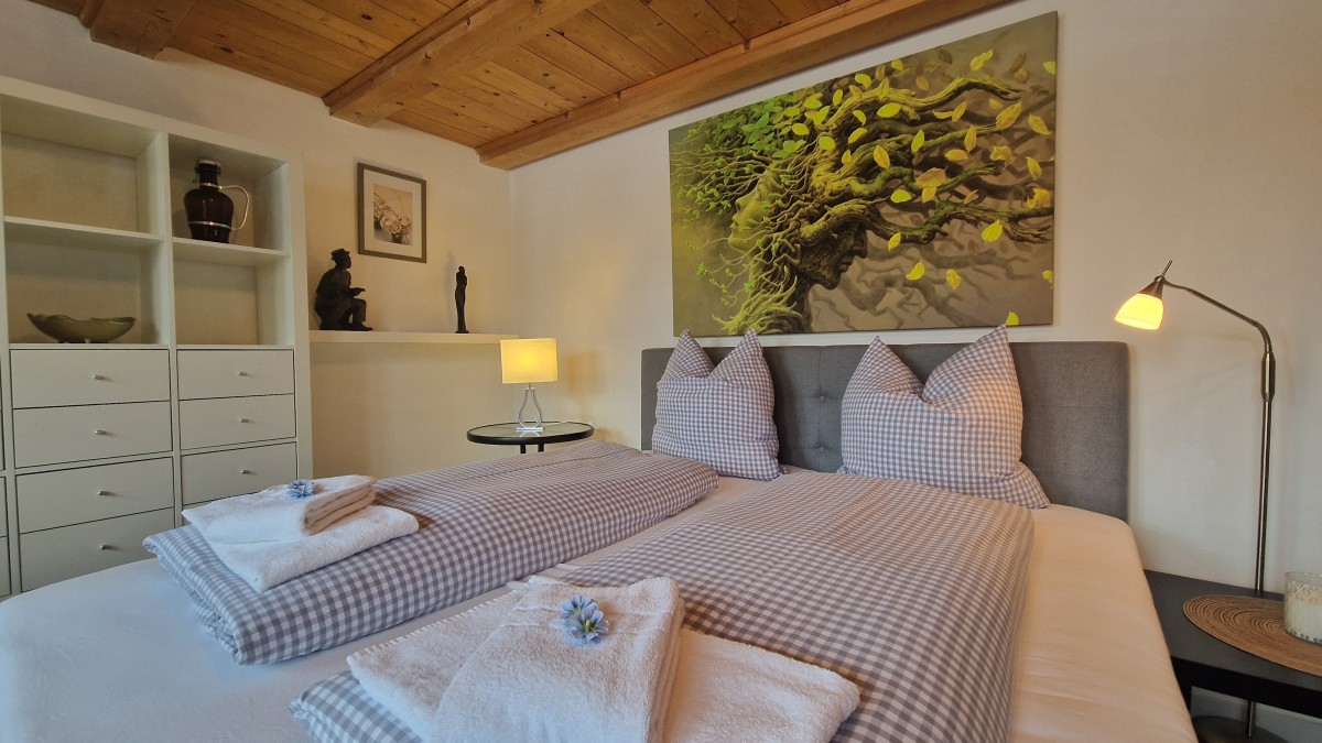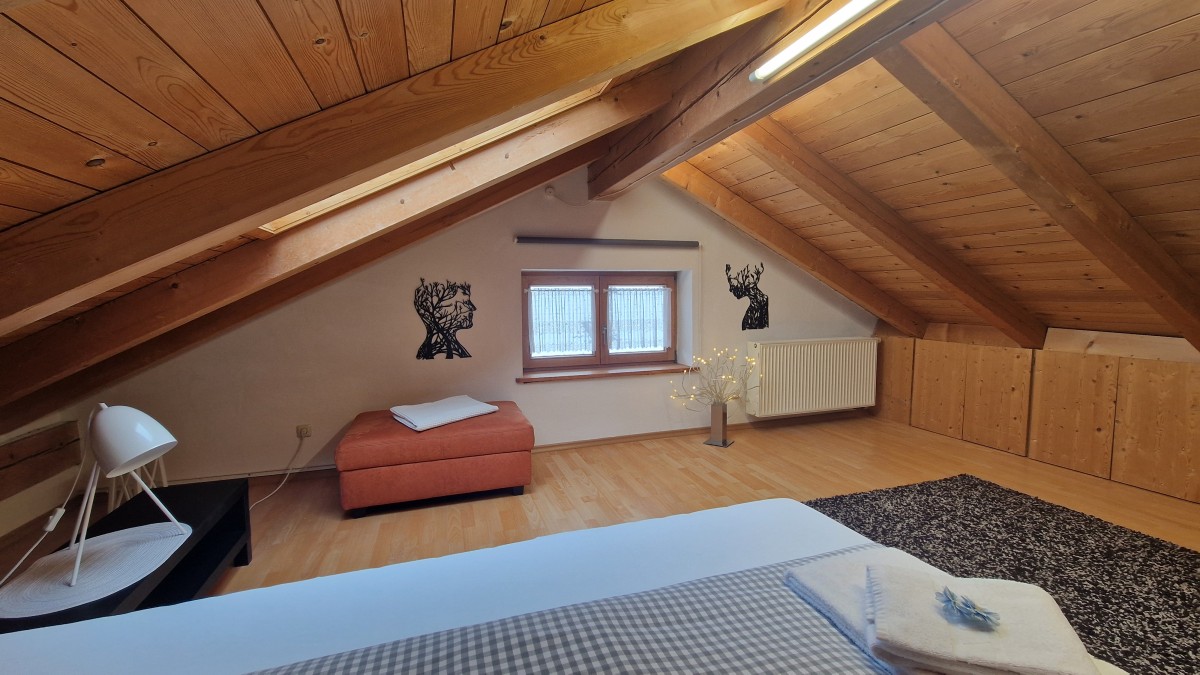 Im Obergeschoss stehen zwei Schlafzimmer mit jeweils ein Doppelbett und TV und ein Wannenbad mit WC zur Verfügung, ein zusätzliches Schlafzimmer mit einem Queensizebett ist über eine sehr steile Treppe im Dachgeschoss erreichbar.