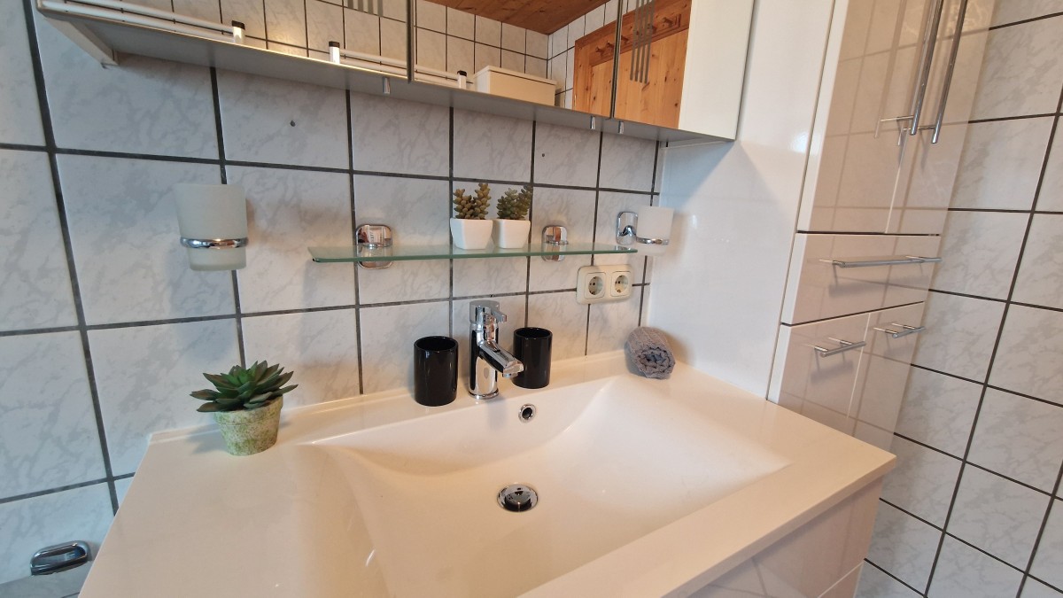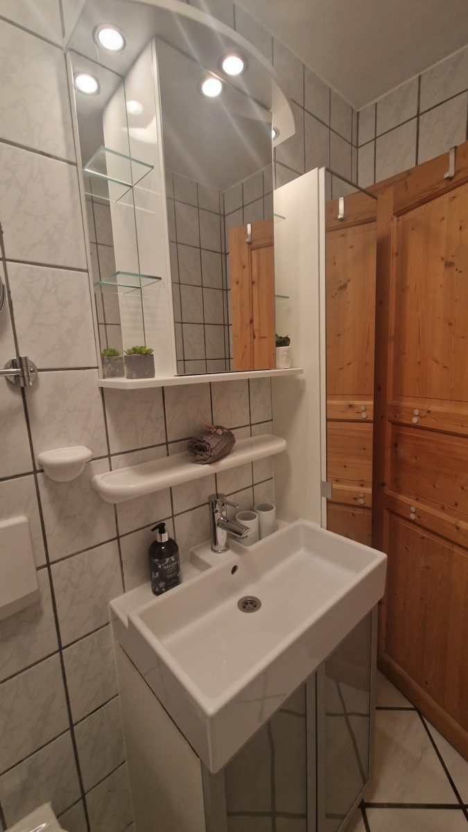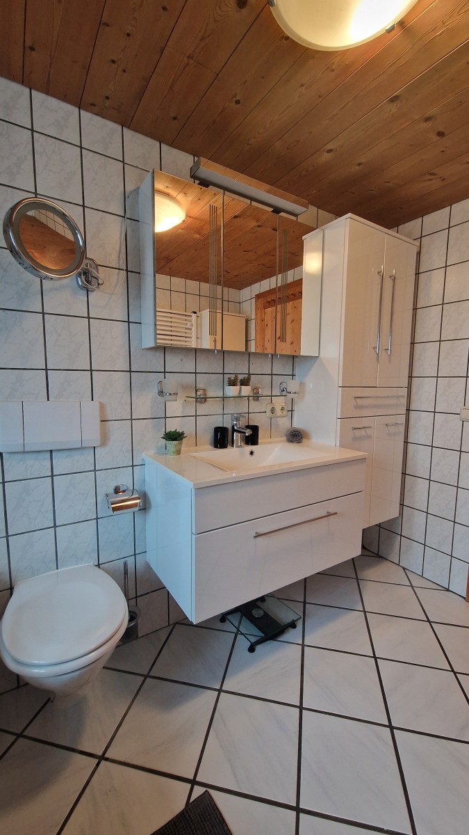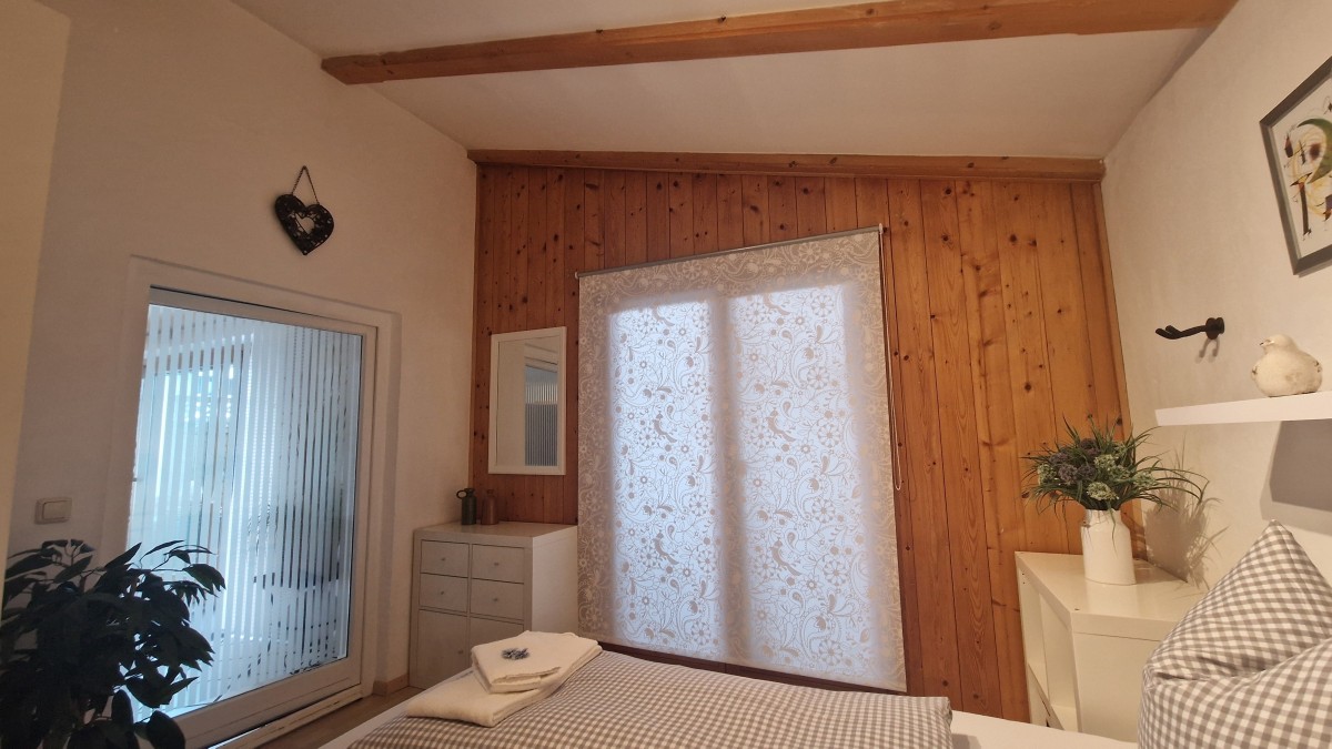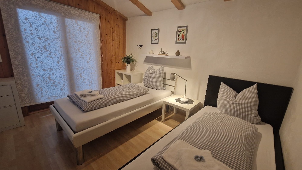 Im Obergeschoss stehen zwei Schlafzimmer mit jeweils ein Doppelbett und TV und ein Wannenbad mit WC zur Verfügung, ein zusätzliches Schlafzimmer mit einem Queensizebett ist über eine sehr steile Treppe im Dachgeschoss erreichbar.