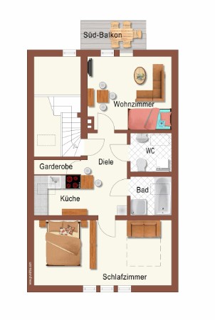 Die Wohnung mit Südbalkon besteht aus einem Wohnraum mit einem Schlafsofa für 2 Personen, einem Einzelbett und einem Essbereich, einer vollständig ausgestatteten Einbauküche, einem Schlafzimmer mit 2 Doppelbetten, sowie einem Bad mit Wanne und Dusche und einer getrennten Toilette.