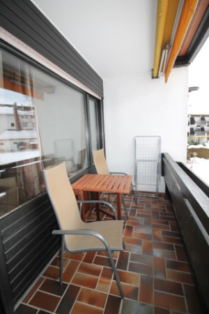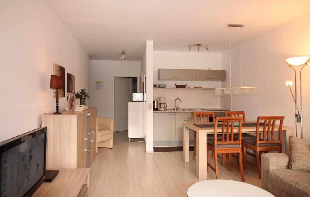 Die Wohnung besteht aus einem Wohnraum mit Küchenzeile, einem Essplatz und einer Sitzgruppe mit Schlafsofa, 2 Schlafräumen mit einem Doppelbett bzw. zwei Einzelbetten, einem Wannenbad mit Duschvorrichtung und WC sowie einer Diele. Vom Wohnzimmer aus hat man Zugang zum SW-Balkon mit Markise und vom Schlafzimmer aus zum NW-Balkon. Ein Bügelbrett und ein Bügeleisen sind ebenfalls vorhanden. Ein Tiefgaragenstellplatz ist vorhanden (Duplex, max. Höhe 1,60)