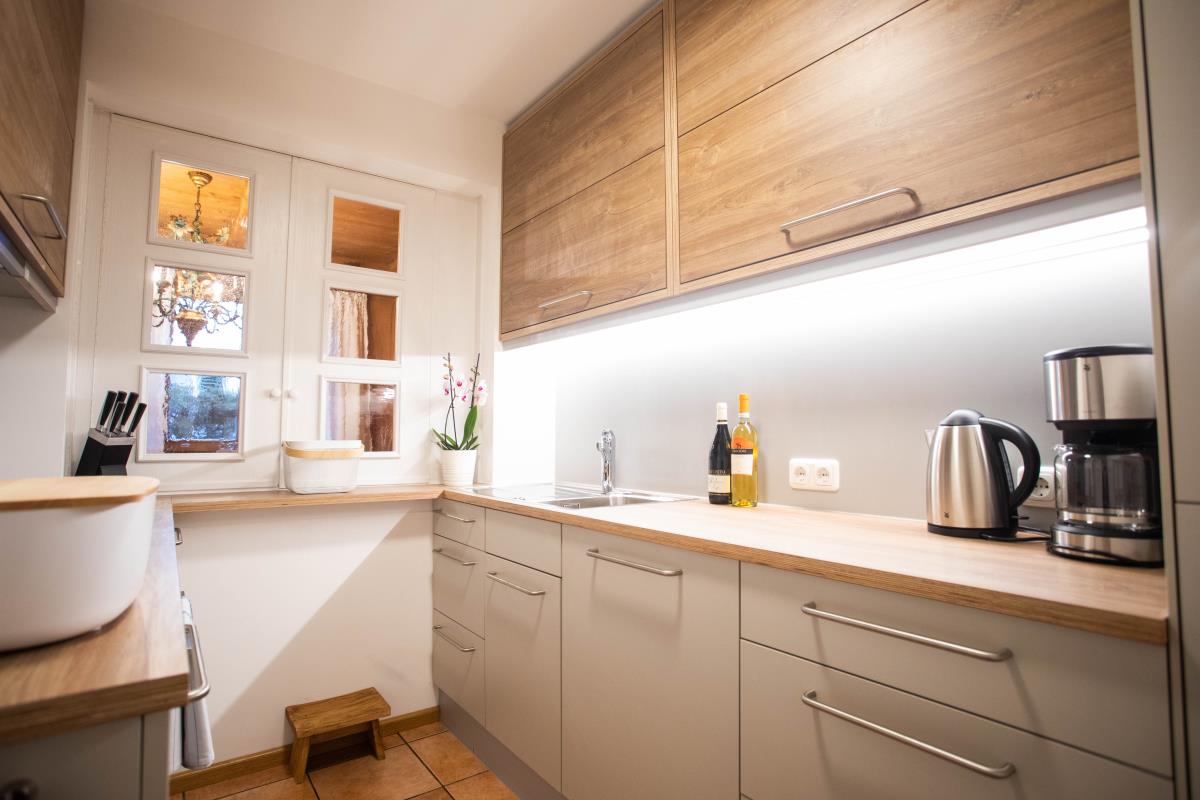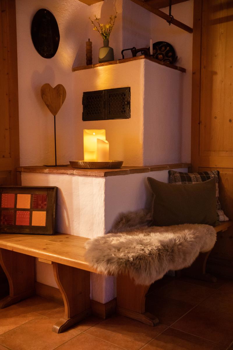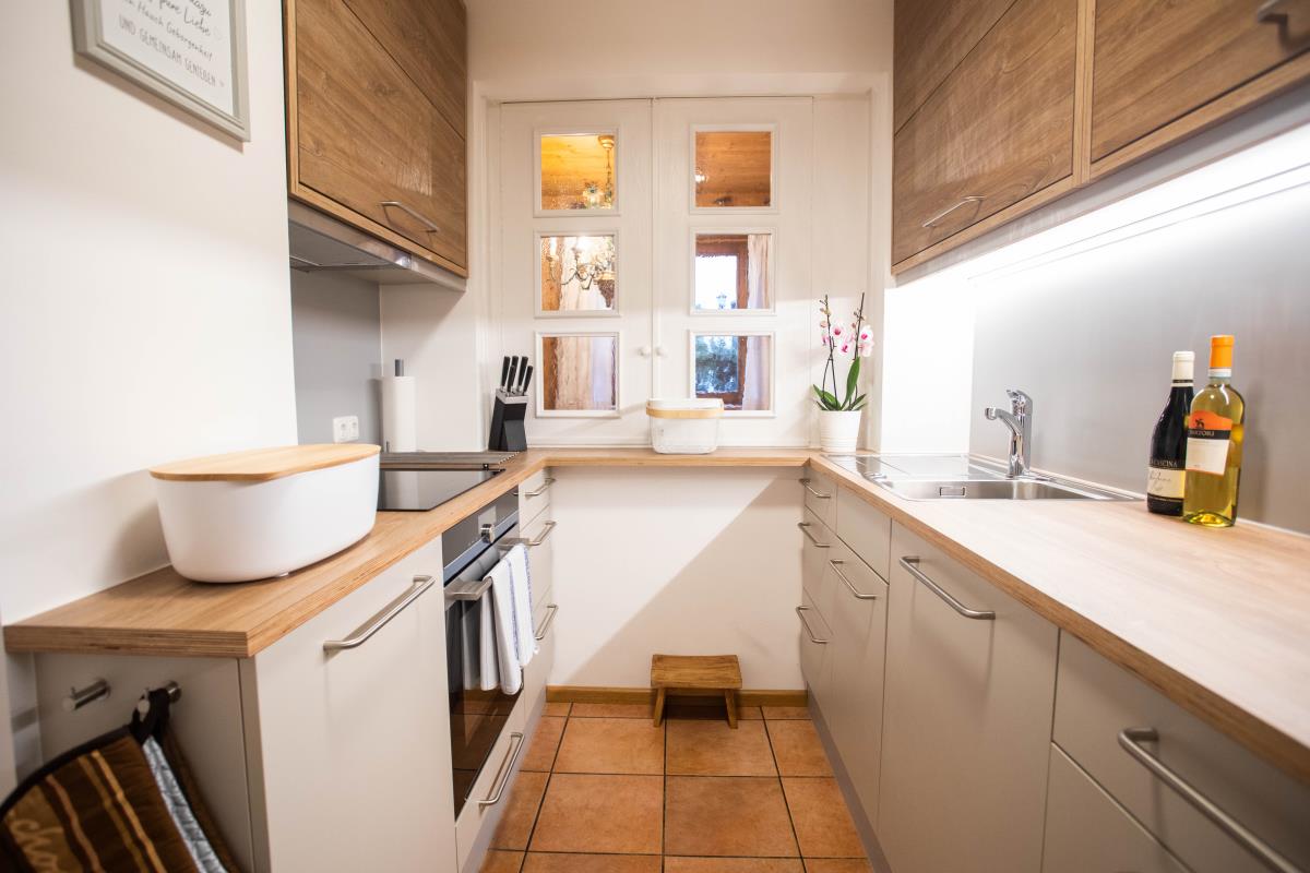 Die geräumige, holzverkleidete bayrische Stube ist mit einem großen Sofa ausgestattet und bietet ausreichend Platz, so dass man sich nach einem erlebnisreichen Urlaubstag perfekt erholen kann. Die Essecke mit Eckbank ist für ein gemütliches Zusammensitzen optimal geeignet. An kalten Herbst- und Wintertagen sorgt zusätzlich ein Kachelofen für lauschige Wärme und Gemütlichkeit. Die Wohnung hat eine kleine aber vollausgestattete Einbauküche mit Durchreiche zum Essplatz.