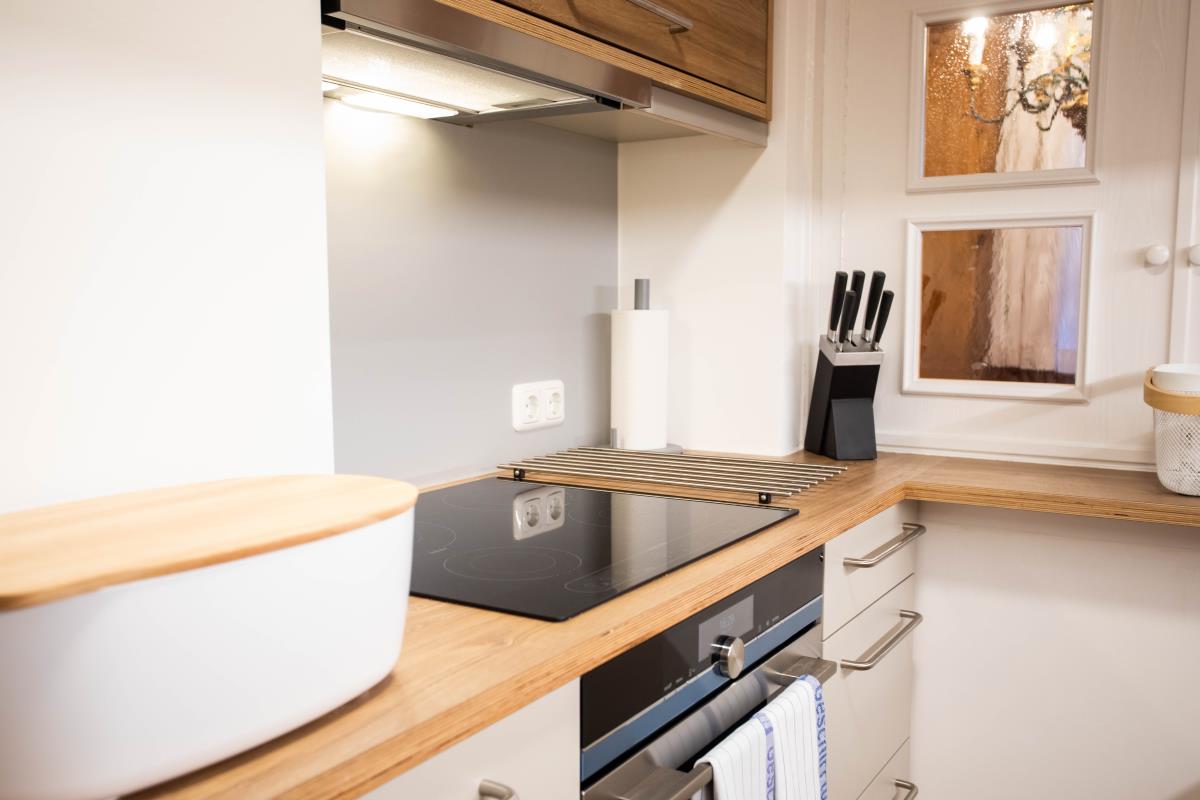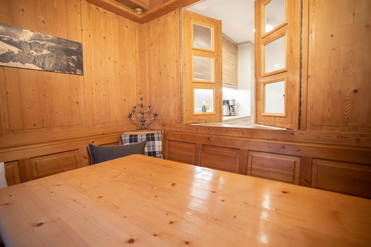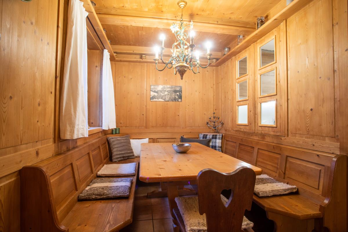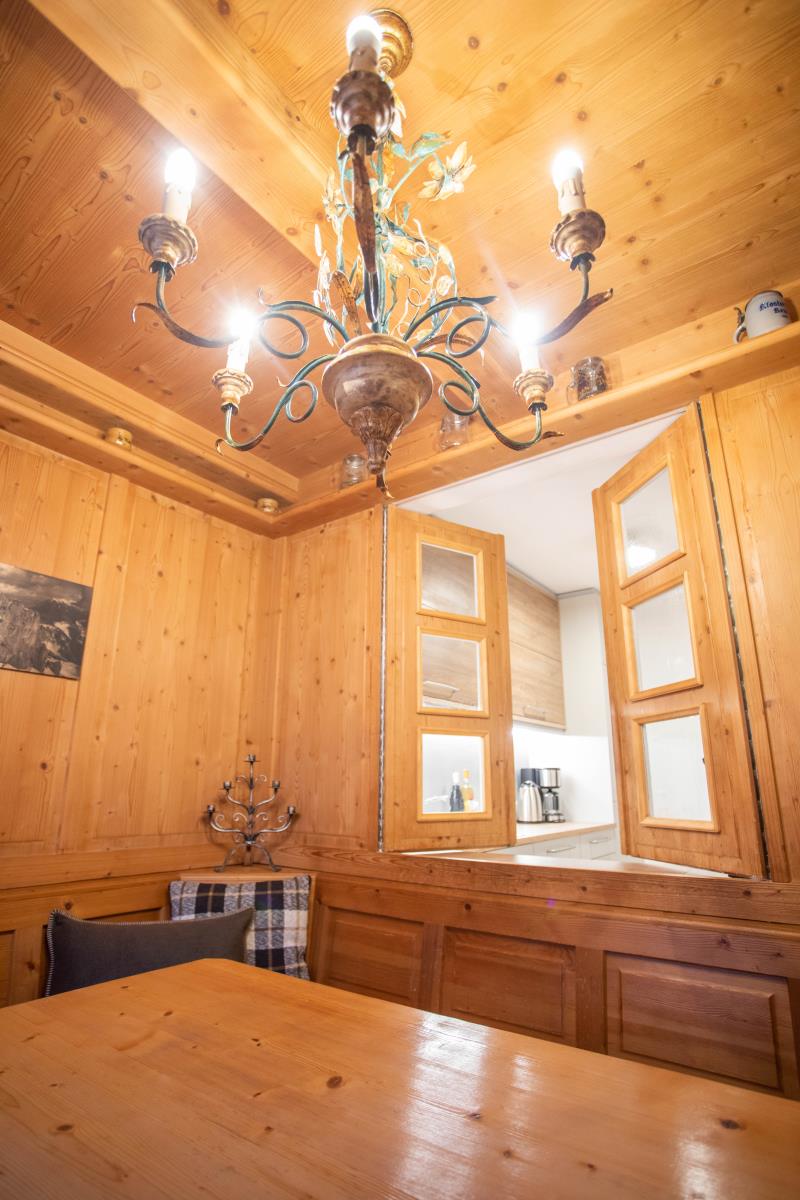 Die geräumige, holzverkleidete bayrische Stube ist mit einem großen Sofa ausgestattet und bietet ausreichend Platz, so dass man sich nach einem erlebnisreichen Urlaubstag perfekt erholen kann. Die Essecke mit Eckbank ist für ein gemütliches Zusammensitzen optimal geeignet. An kalten Herbst- und Wintertagen sorgt zusätzlich ein Kachelofen für lauschige Wärme und Gemütlichkeit. Die Wohnung hat eine kleine aber vollausgestattete Einbauküche mit Durchreiche zum Essplatz.