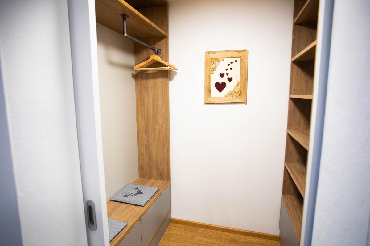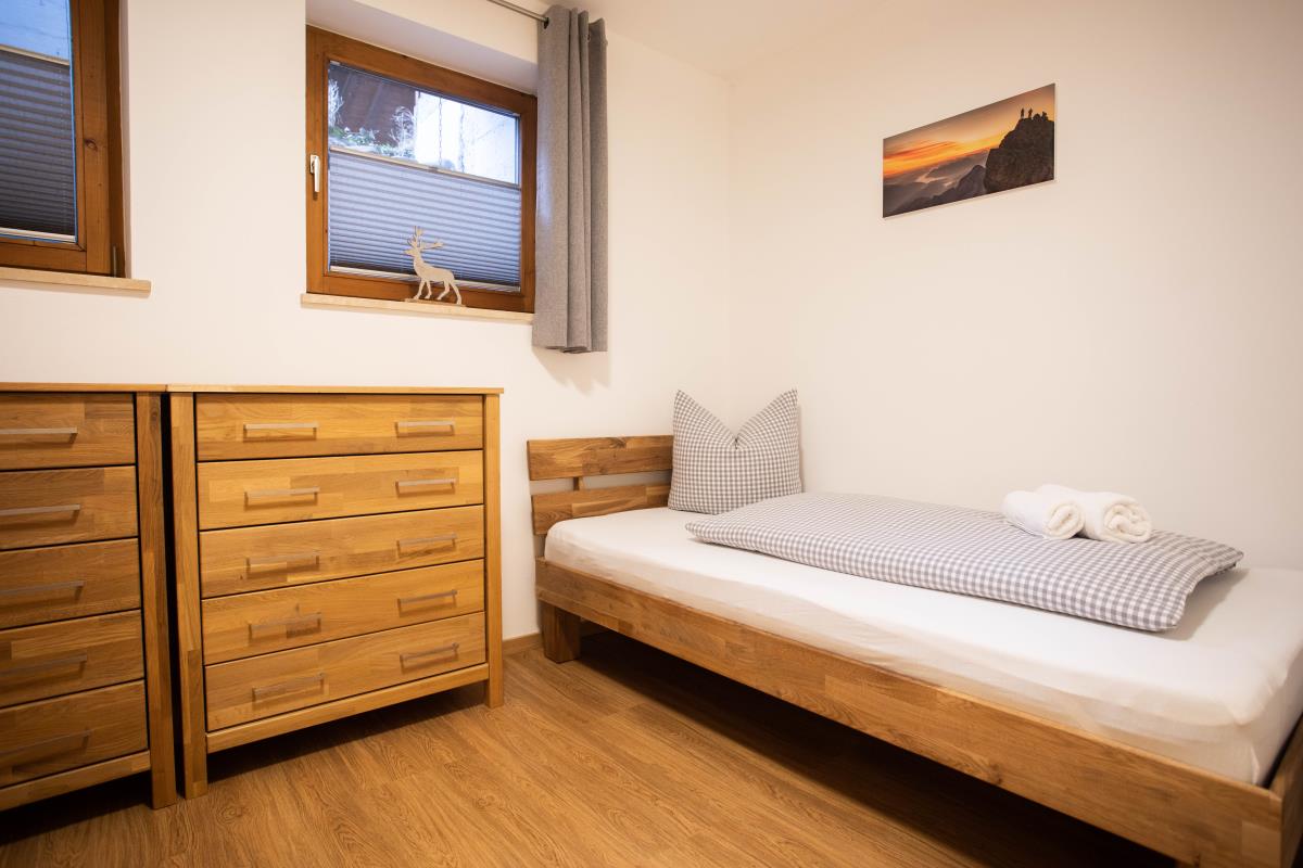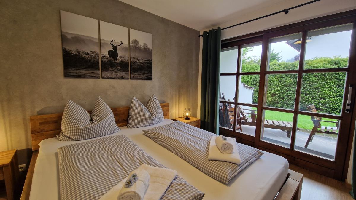 Die Ferienwohnung verfügt über drei Schlafzimmer. Im UG befindet sich ein Schlafzimmer mit einem Doppelbett (200x200), zwei Kleiderschränke und ein Fernseher, sowie ein kleines Schlafzimmer mit 2 Einzelbetten. Ein weiteres Schlafzimmer mit Doppelbett ist im Erdgeschoss und hat einen eigenen Zugang zur Terrasse und zum Garten. Der begehbare Kleiderschrank rundet den hübschen Raum ab.