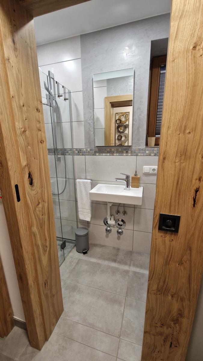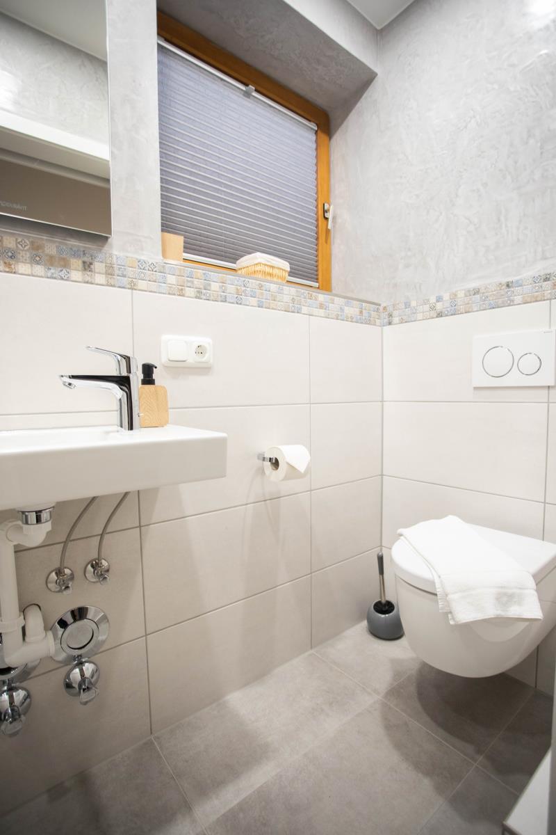 Ein Badezimmer mit Wanne und Duschvorrichtung und Toilette ist im Erdgeschoss. Ein weiteres kleines Bad mit Dusche und WC befindet sich im Untergeschoss.