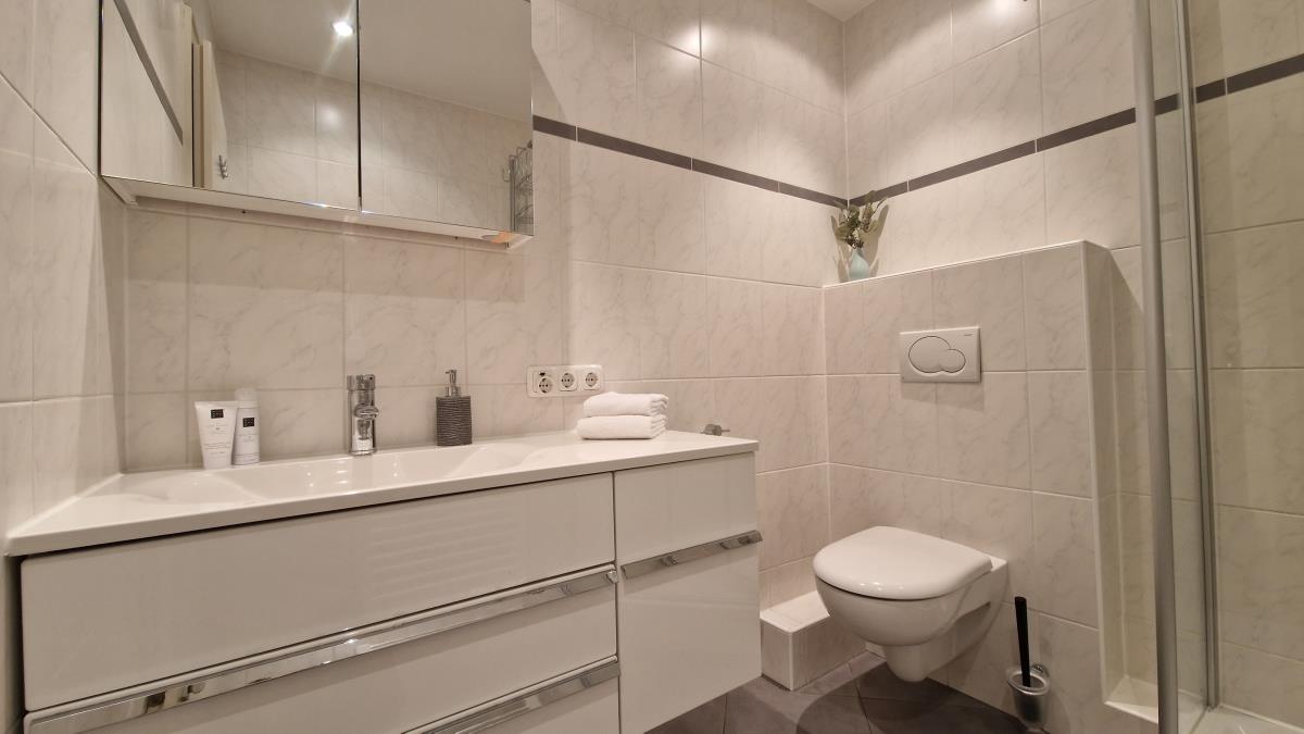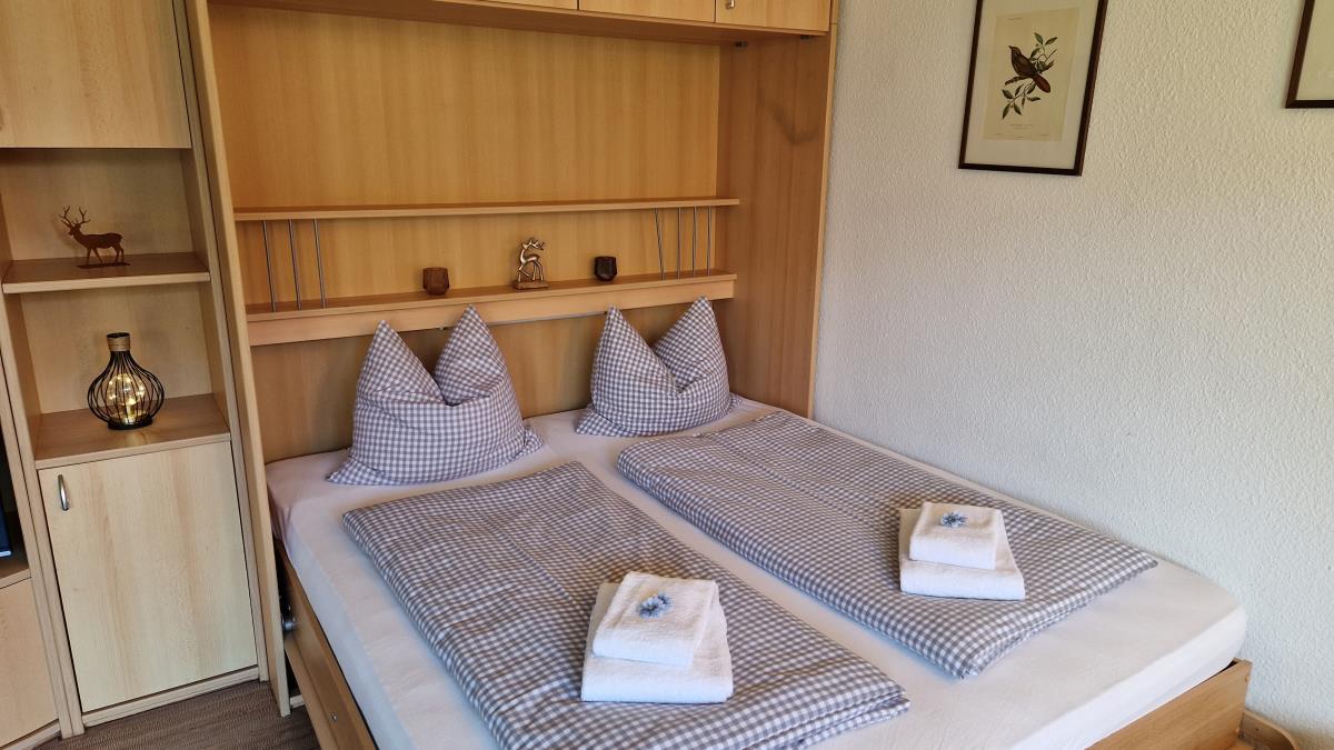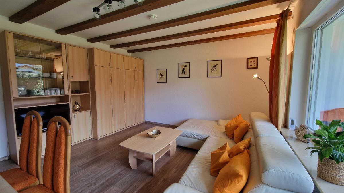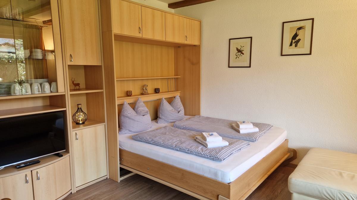 Die geschmackvoll und gemütlich eingerichtete Wohnung besteht aus einem Wohnzimmer, einem Essplatz und einem Schrankbett (2,00 x 1,80 m) sowie einer Sitzgruppe, einem Schlafzimmer mit Französischem Bett und Fernseher, einer Einbauküche und einem Duschbad mit WC.