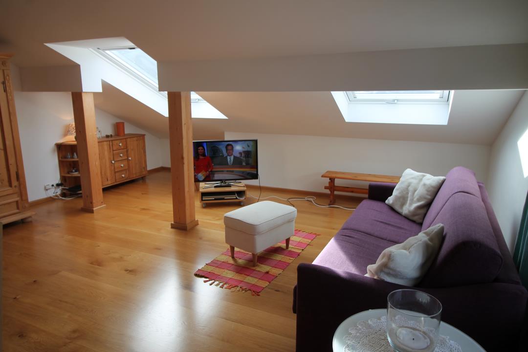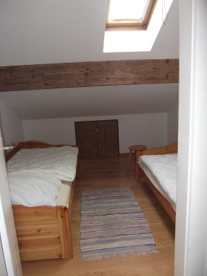 In beiden Wohnzimmern ist eine Essecke und eine bequeme Schlafcouch für je 2 Personen. Im Schlafraum 1 mit Dachschräge befinden sich zwei Betten (140 cm und 90 cm breit). Schlafraum 2 mit Dachschräge ist mit 2 Einzelbetten ausgestattet. Die Wohnung verfügt über eine Küche und 2 Bäder - ein Wannenbad und ein Duschbad - jeweils mit WC. Schlafzimmer, Küche und Bad haben Dachfenster.