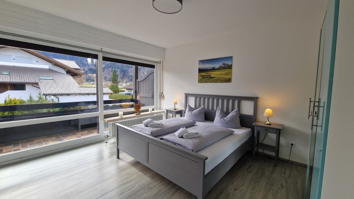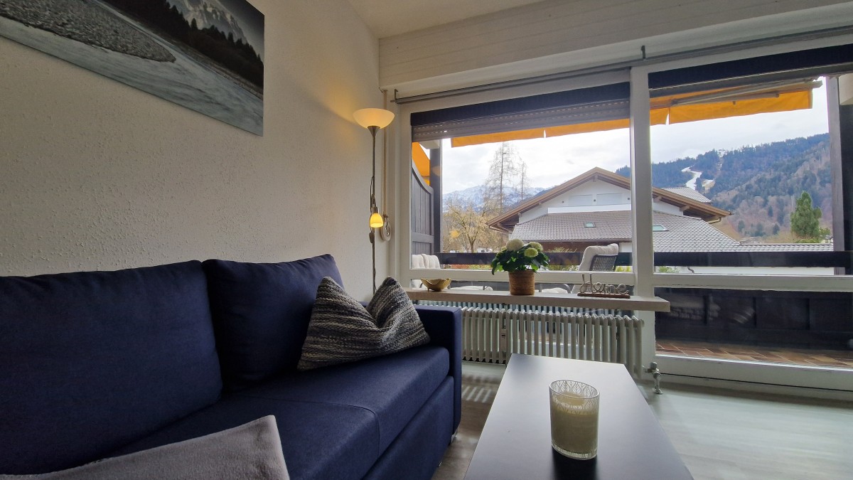 Die zentrumsnahe, ruhige 2-Zimmer Wohnung mit herrlichem Gebirgsblick und breitem Südostbalkon mit Markise liegt im 1. Obergeschoss eines gepflegten Hauses in bayrischem Baustil. Die komplett neu renovierte Wohnung besteht aus einem offenen Wohn- und Küchenbereich mit einer Einbauküche und Essplatz, einem Sofa mit Schlaffunktion, einem Schlafzimmer mit Doppelbett und einem Duschbad. In der Wohnung sind ein Bügelbrett und ein Bügeleisen vorhanden.