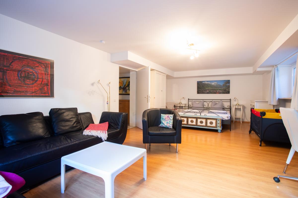 Im Untergeschoss liegen ein helles, großes Schlafzimmer mit einem Doppelbett (1,80 m), eine Sitzgruppe und TV, ein weiteres Schlafzimmer mit Ausziehbett (1,80 m), ein Duschbad mit WC (auf Anfrage), die Waschküche mit Waschmaschine und Trockner und die Zentralheizung.