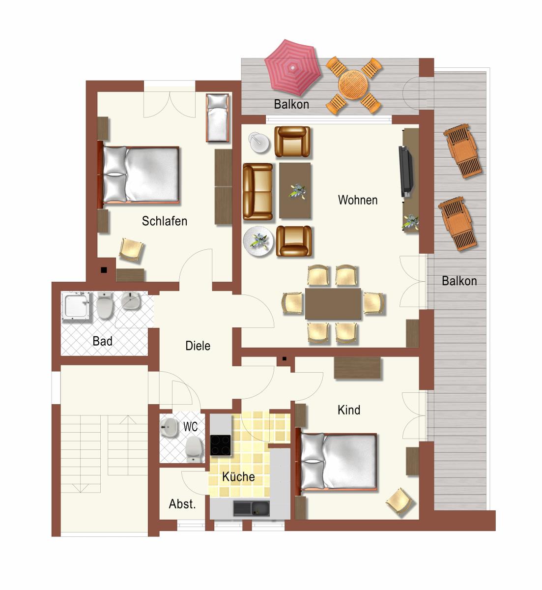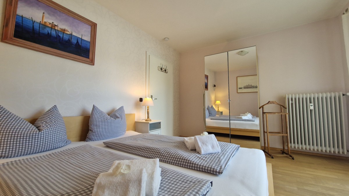 Die helle und ansprechende Wohnung besteht aus einem Wohnzimmer mit einem Essplatz und einer Sitzgruppe mit Schlafsofa, zwei Schlafzimmern, jeweils mit Doppelbett, einer komplett ausgestatteten Einbauküche, einem Abstellraum, einem neuen Duschbad mit WC und einem Gäste-WC.