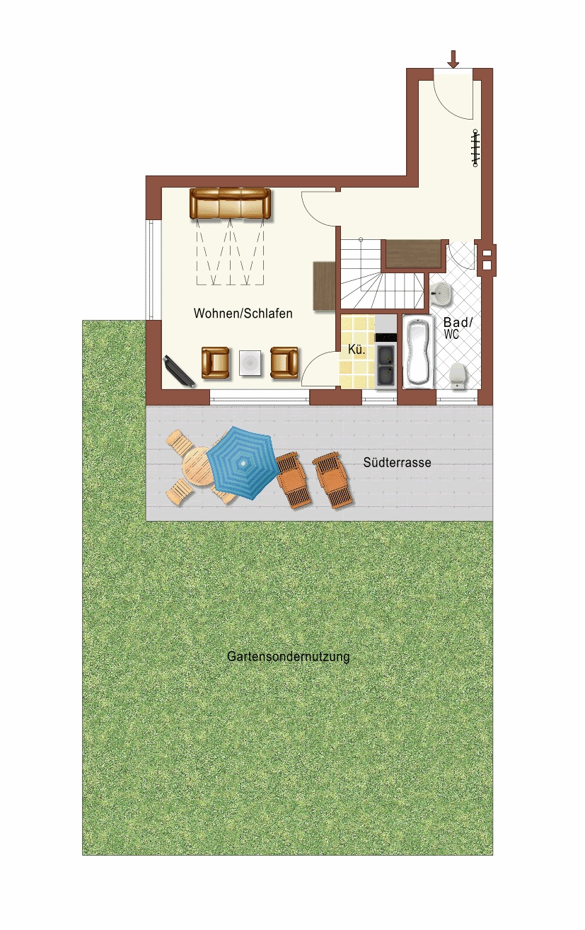 Das Wohn-/Schlafzimmer ist mit einer Schlafcouch, die zu einem 160x200 cm großem Bett ausgeklappt werden kann, und einer Sitzgruppe ausgestattet. Die Küche ist vom Wohnraum getrennt und komplett ausgestattet. Ein neues Duschbad mit WC ergänzt die kleine, aber sehr ansprechende Wohnung.