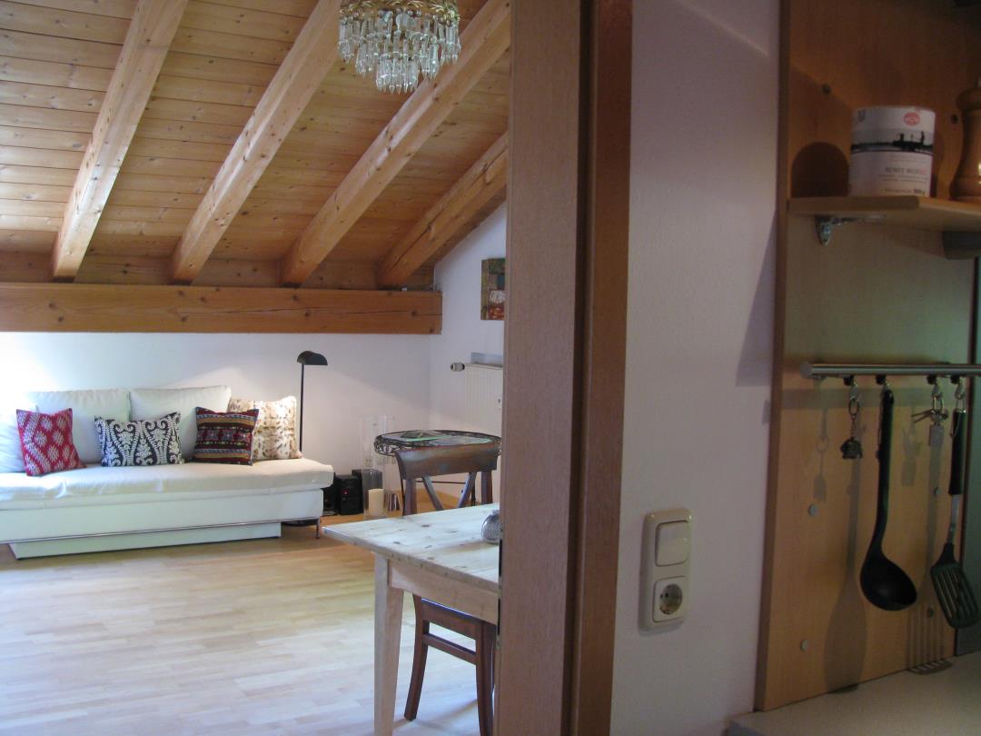 Die im Dachgeschoss gelegene Atelier-Wohnung verbindet Moderne und Tradition und befindet sich im Ortsteil Partenkirchen unterhalb des Berges Wank.