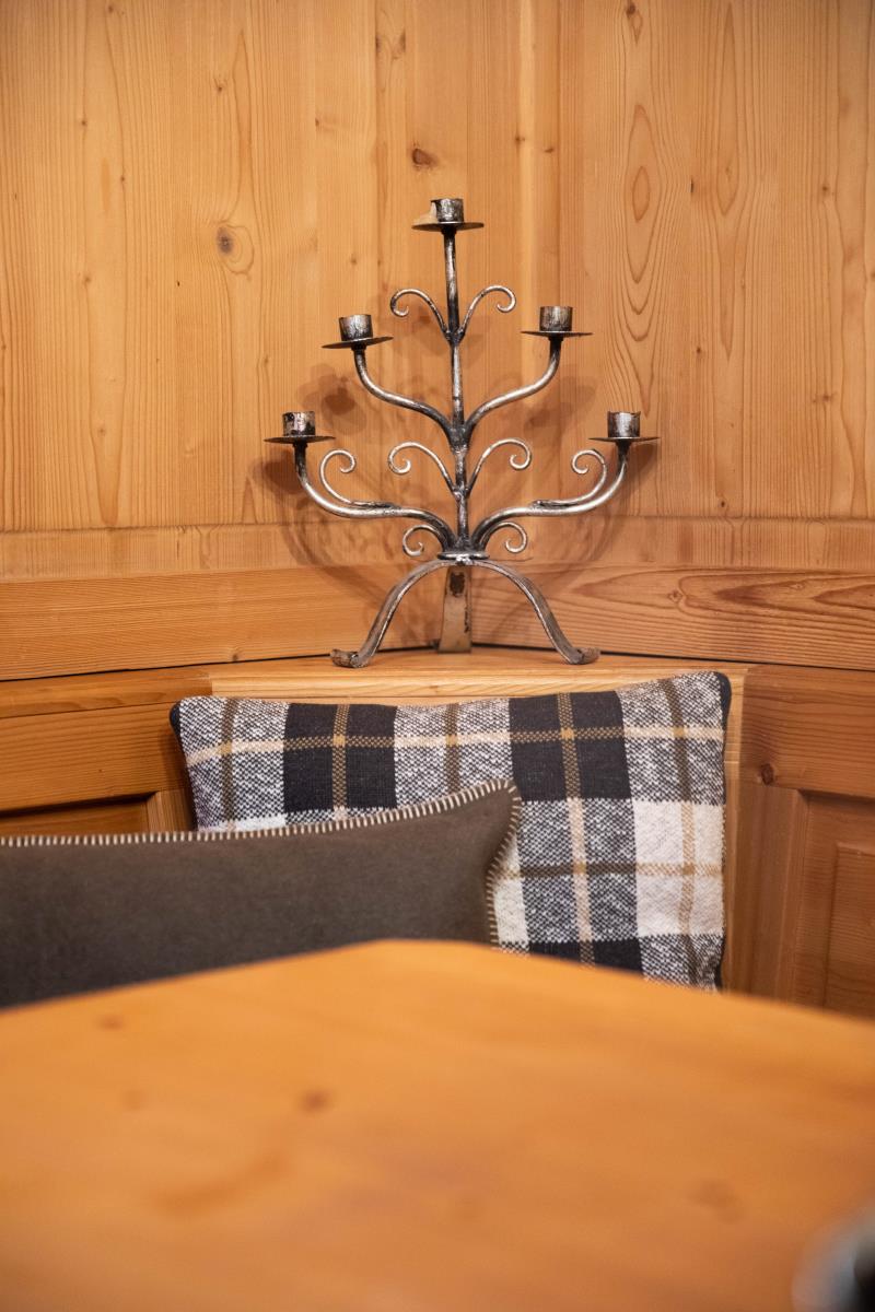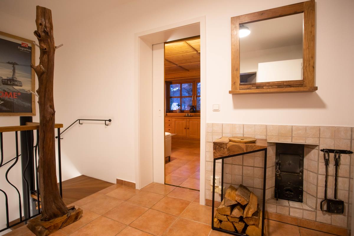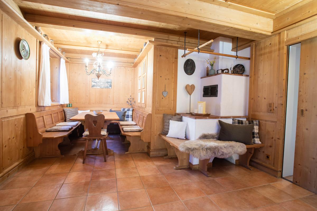 Die geräumige, holzverkleidete bayrische Stube ist mit einem großen Sofa ausgestattet und bietet ausreichend Platz, so dass man sich nach einem erlebnisreichen Urlaubstag perfekt erholen kann. Die Essecke mit Eckbank ist für ein gemütliches Zusammensitzen optimal geeignet. An kalten Herbst- und Wintertagen sorgt zusätzlich ein Kachelofen für lauschige Wärme und Gemütlichkeit. Die Wohnung hat eine kleine aber vollausgestattete Einbauküche mit Durchreiche zum Essplatz.