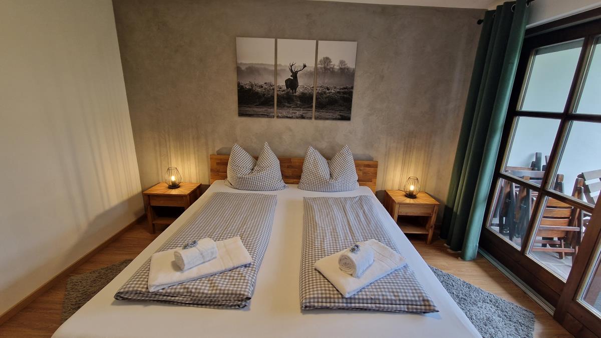 Die Ferienwohnung verfügt über drei Schlafzimmer. Im UG befindet sich ein Schlafzimmer mit einem Doppelbett (200x200), zwei Kleiderschränke und ein Fernseher, sowie ein kleines Schlafzimmer mit 2 Einzelbetten. Ein weiteres Schlafzimmer mit Doppelbett ist im Erdgeschoss und hat einen eigenen Zugang zur Terrasse und zum Garten. Der begehbare Kleiderschrank rundet den hübschen Raum ab.
