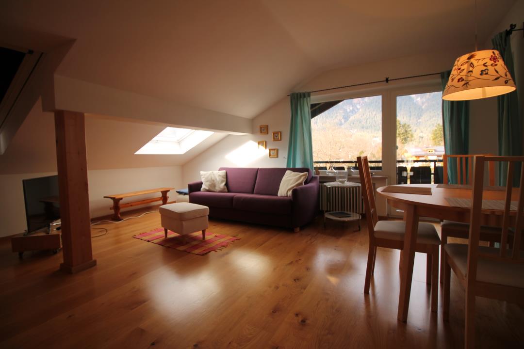 Die 4-Zimmer-Wohnung mit breitem Süd- und Nordbalkon und herrlichem Blick auf die Alpspitze und das Zugspitzmassiv liegt im Dachgeschoss eines Wohnhauses in bayerischem Baustil. Rad- und Wanderwege, sowie Bergbahnen und die Langlaufloipe liegen ganz in der Nähe. Zum Riessersee und dem dortigen Freibad sind es ca. 10 - 15 Gehminuten, bzw. 5 Minuten mit dem Auto.