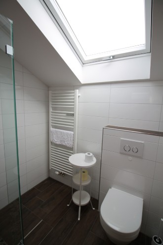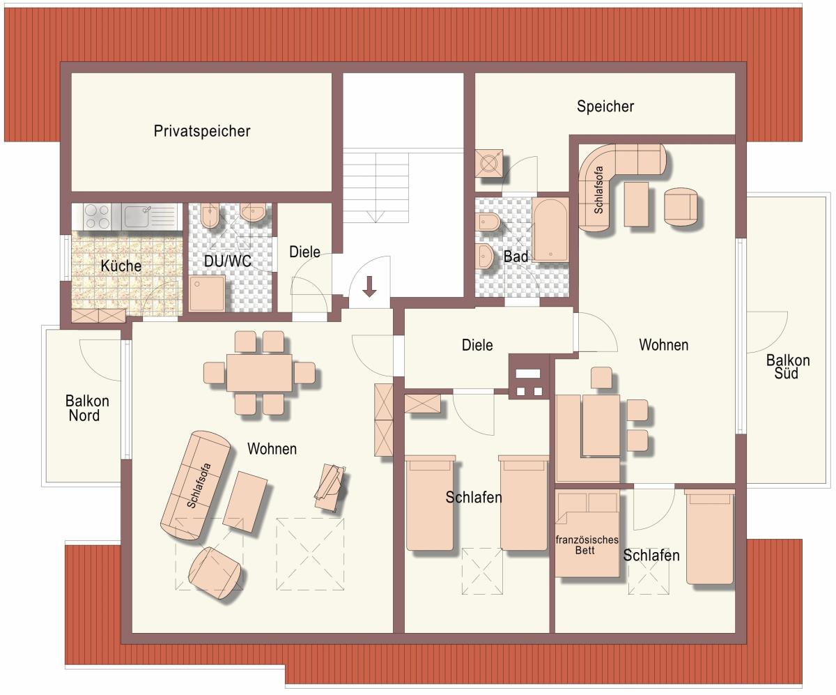 In beiden Wohnzimmern ist eine Essecke und eine bequeme Schlafcouch für je 2 Personen. Im Schlafraum 1 mit Dachschräge befinden sich zwei Betten (140 cm und 90 cm breit). Schlafraum 2 mit Dachschräge ist mit 2 Einzelbetten ausgestattet. Die Wohnung verfügt über eine Küche und 2 Bäder - ein Wannenbad und ein Duschbad - jeweils mit WC. Schlafzimmer, Küche und Bad haben Dachfenster.