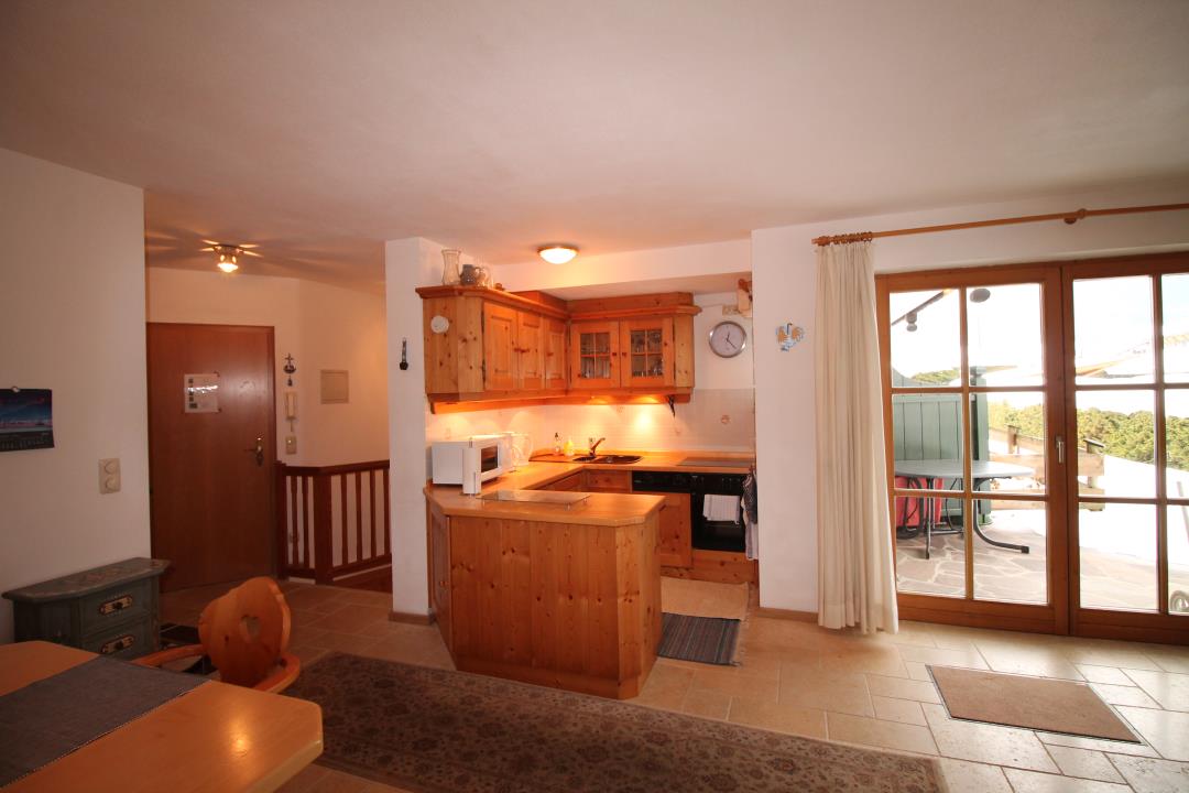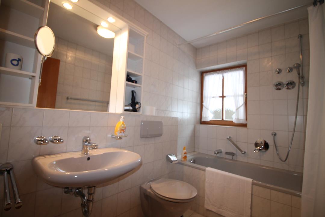 Die sehr gemütlich eingerichtete Wohnung hat eine sonnige Süd-Terrasse mit Garten und einen herrlichen Gebirgsblick. Sie besteht im Erdgeschoss aus einem Wohnzimmer mit einer Sitzgruppe und einer gemütlichen Sitzecke, einer komplett ausgestatteten Einbauküche sowie einem Wannenbad mit WC. Von der Diele führt eine Wendeltreppe ins Untergeschoss, wo sich ein gemütlicher Schlafraum mit Doppelbett, ein kleines Schlafzimmer mit einem Stockbett für 2 Kinder und ein Duschbad mit WC befinden.