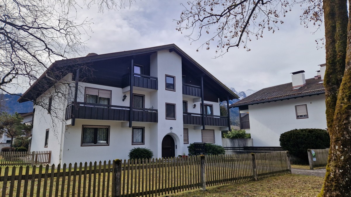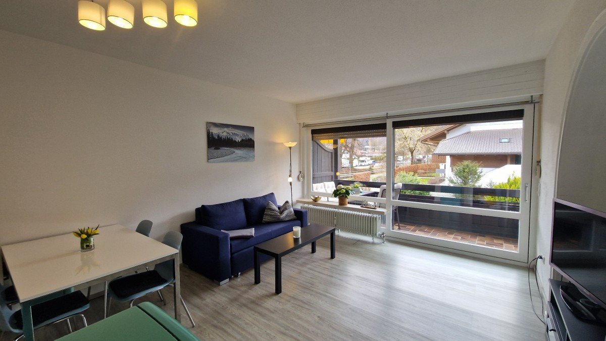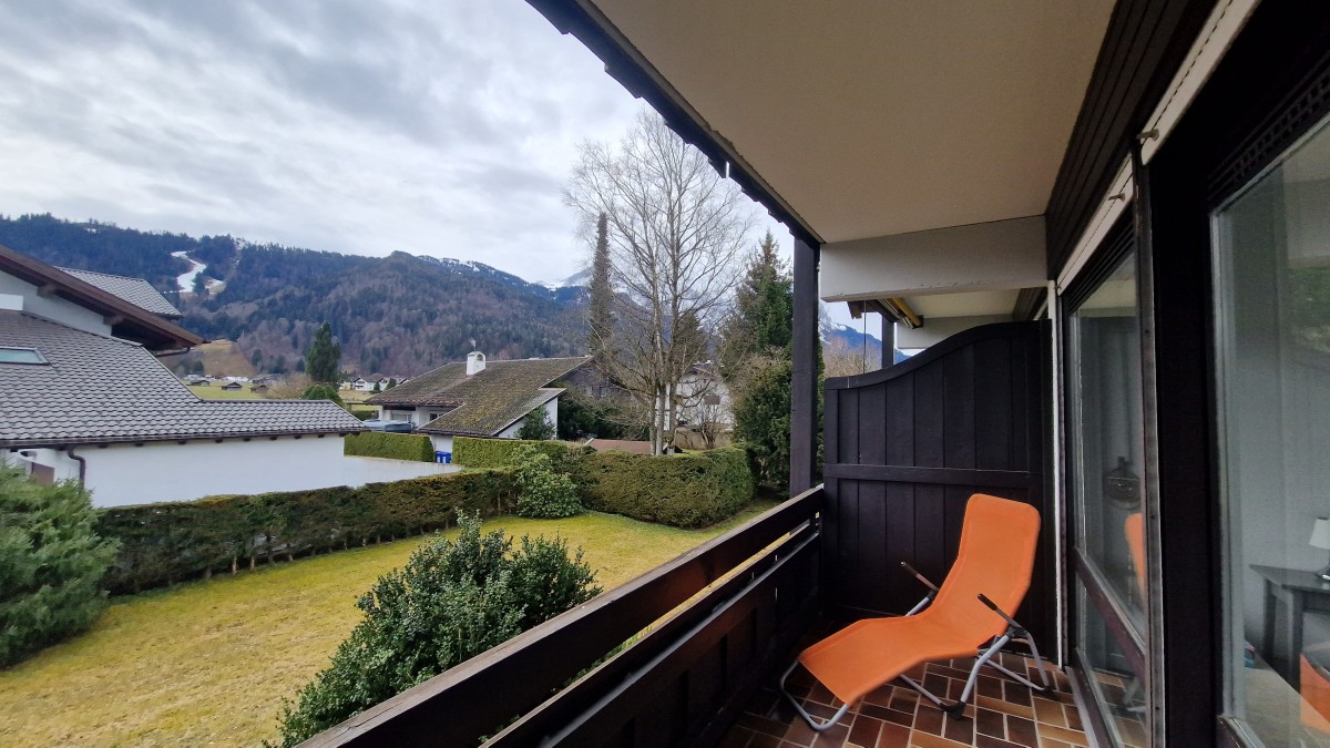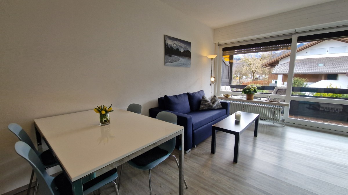 Die zentrumsnahe, ruhige 2-Zimmer Wohnung mit herrlichem Gebirgsblick und breitem Südostbalkon mit Markise liegt im 1. Obergeschoss eines gepflegten Hauses in bayrischem Baustil. Die komplett neu renovierte Wohnung besteht aus einem offenen Wohn- und Küchenbereich mit einer Einbauküche und Essplatz, einem Sofa mit Schlaffunktion, einem Schlafzimmer mit Doppelbett und einem Duschbad. In der Wohnung sind ein Bügelbrett und ein Bügeleisen vorhanden.