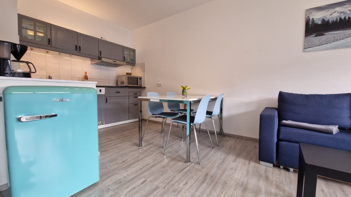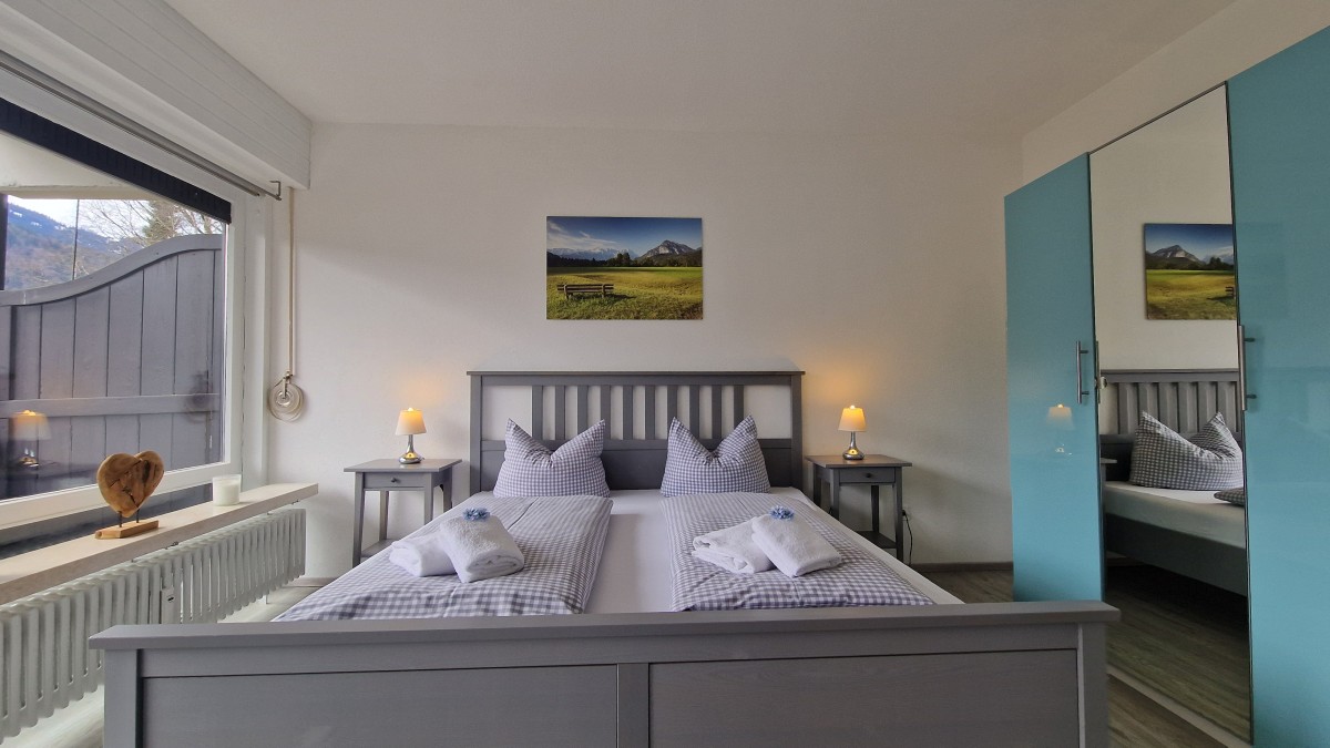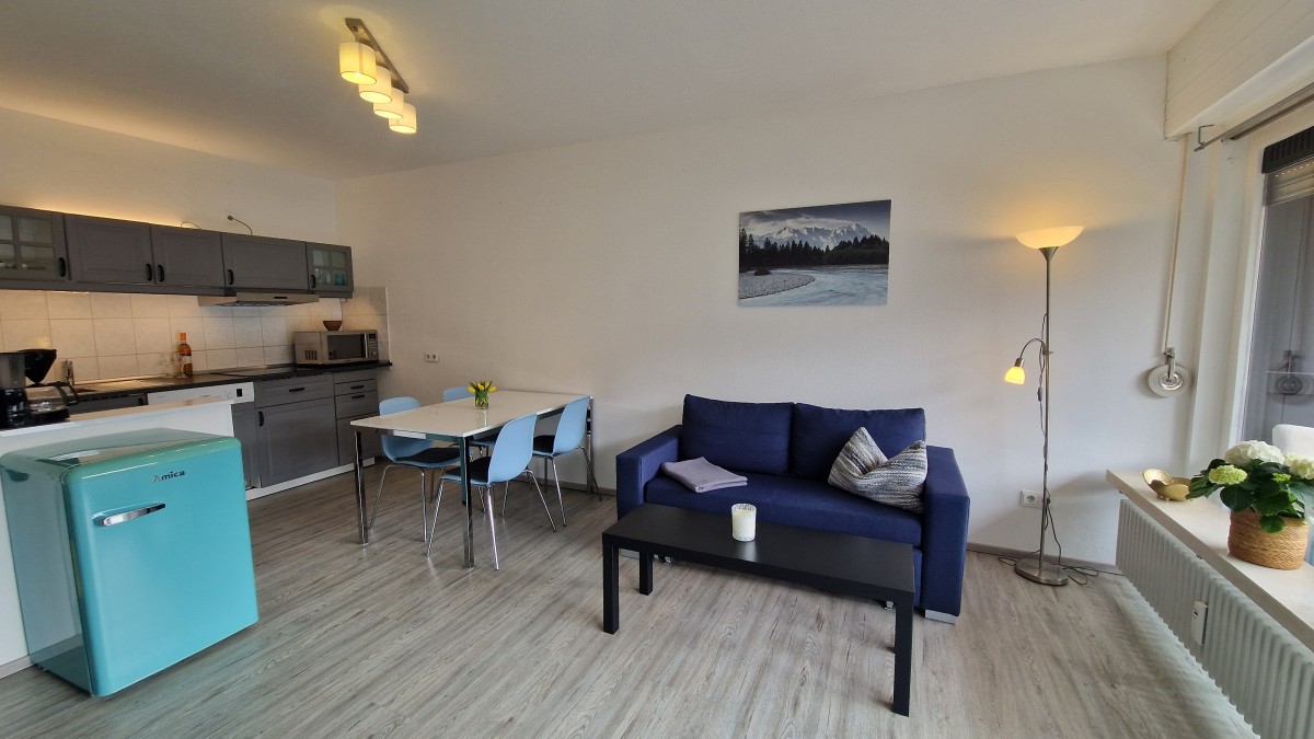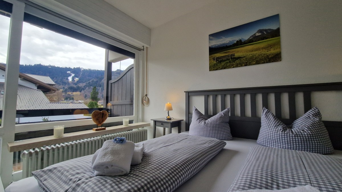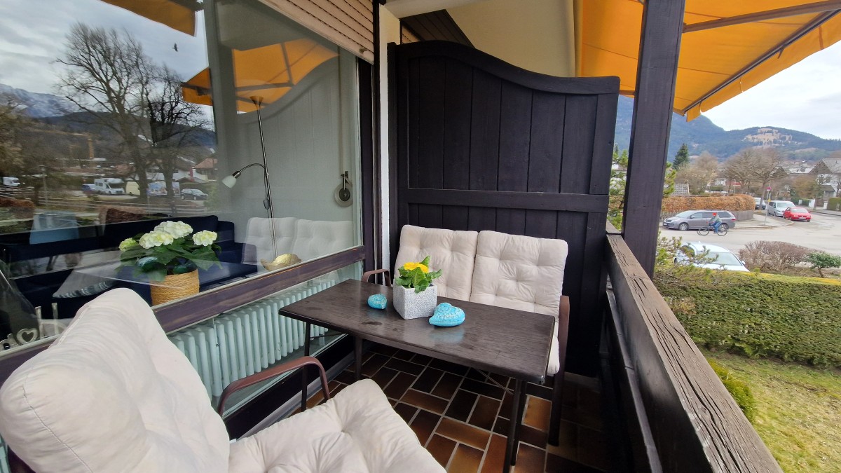 Die zentrumsnahe, ruhige 2-Zimmer Wohnung mit herrlichem Gebirgsblick und breitem Südostbalkon mit Markise liegt im 1. Obergeschoss eines gepflegten Hauses in bayrischem Baustil. Die komplett neu renovierte Wohnung besteht aus einem offenen Wohn- und Küchenbereich mit einer Einbauküche und Essplatz, einem Sofa mit Schlaffunktion, einem Schlafzimmer mit Doppelbett und einem Duschbad. In der Wohnung sind ein Bügelbrett und ein Bügeleisen vorhanden.